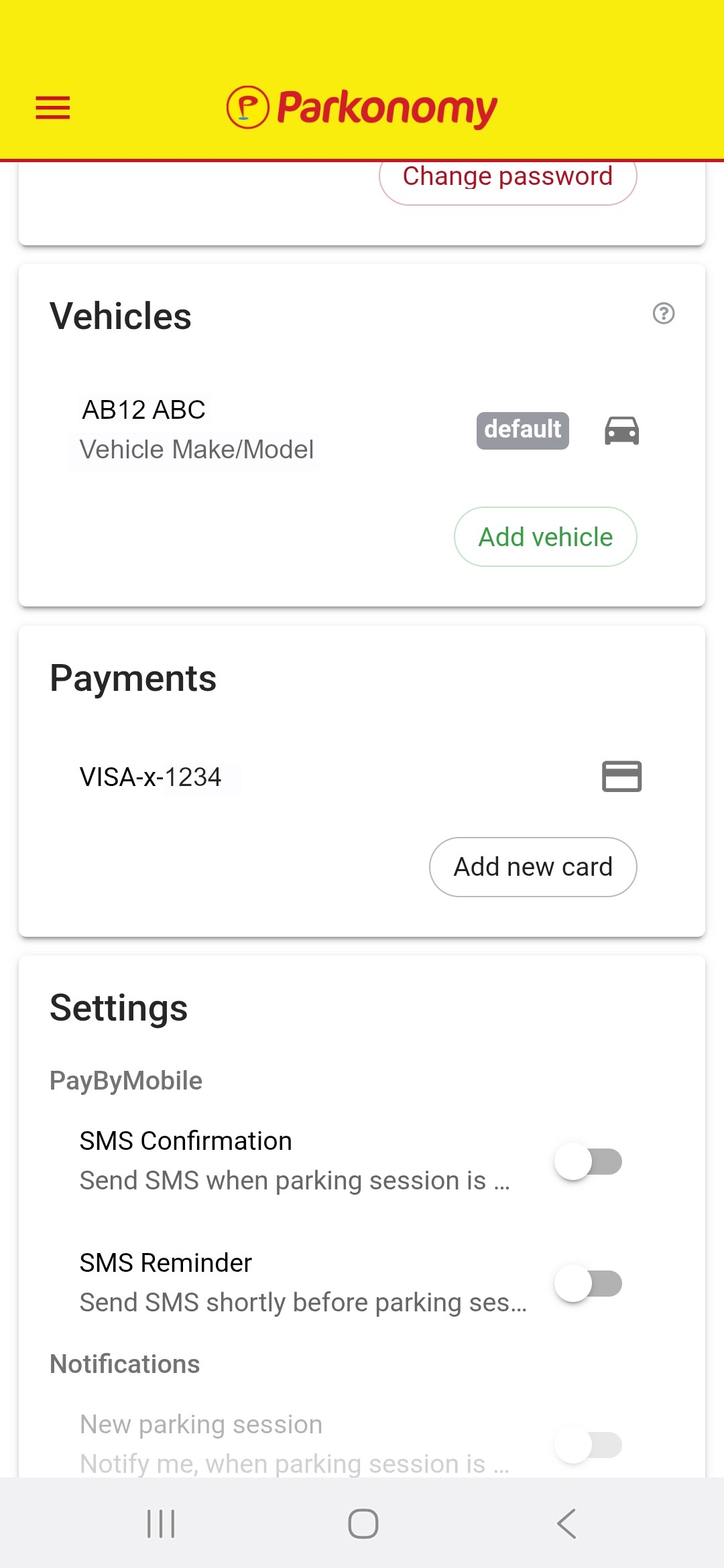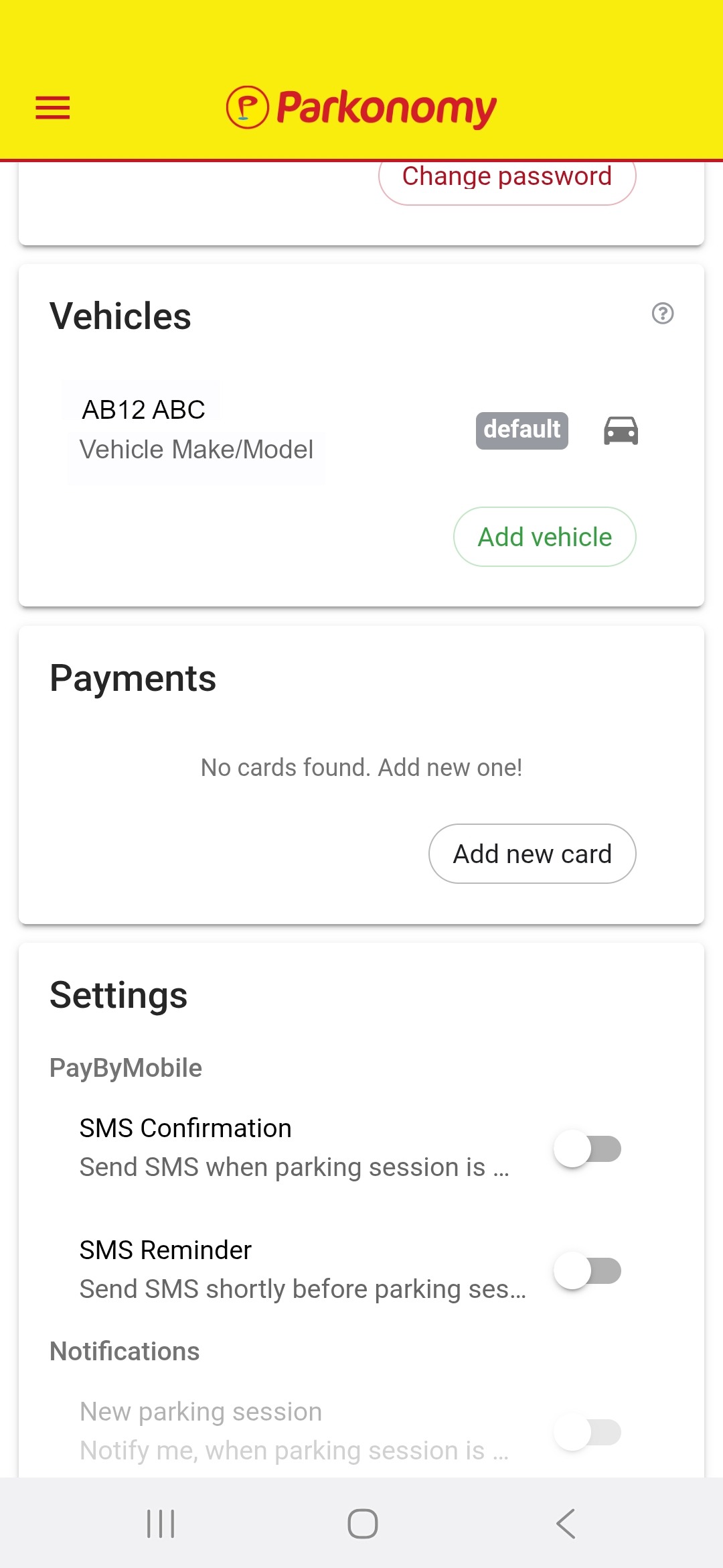 Currently the feature to add a payment card this way is unavailable. You can only add card details when booking a parking session through the booking page. |