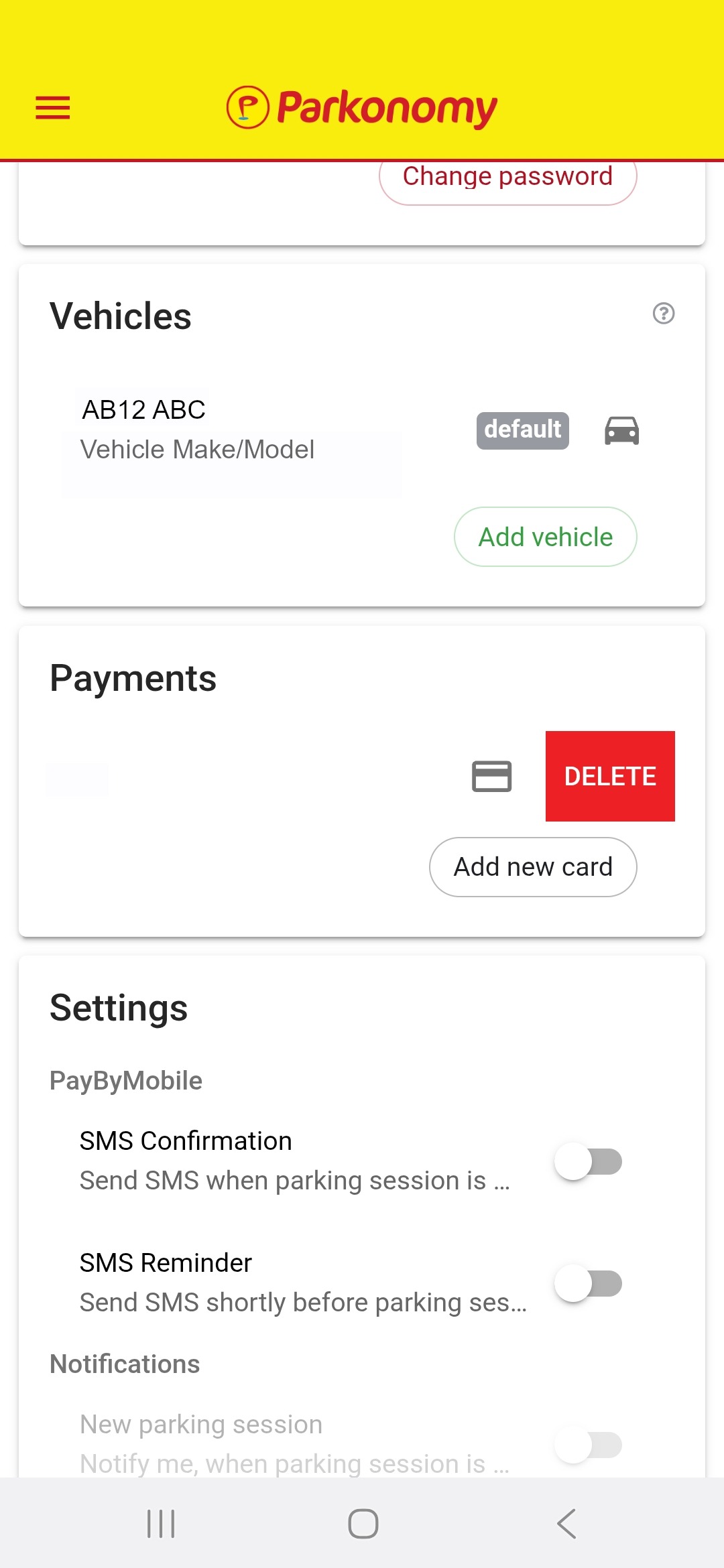 After booking a parking session your card details are partially displayed under ‘Payments’ in the main menu. These details can be removed if you wish. To remove, hold and swipe left to reveal ‘DELETE’, lift your finger and tap on the red ‘DELETE’ icon. |