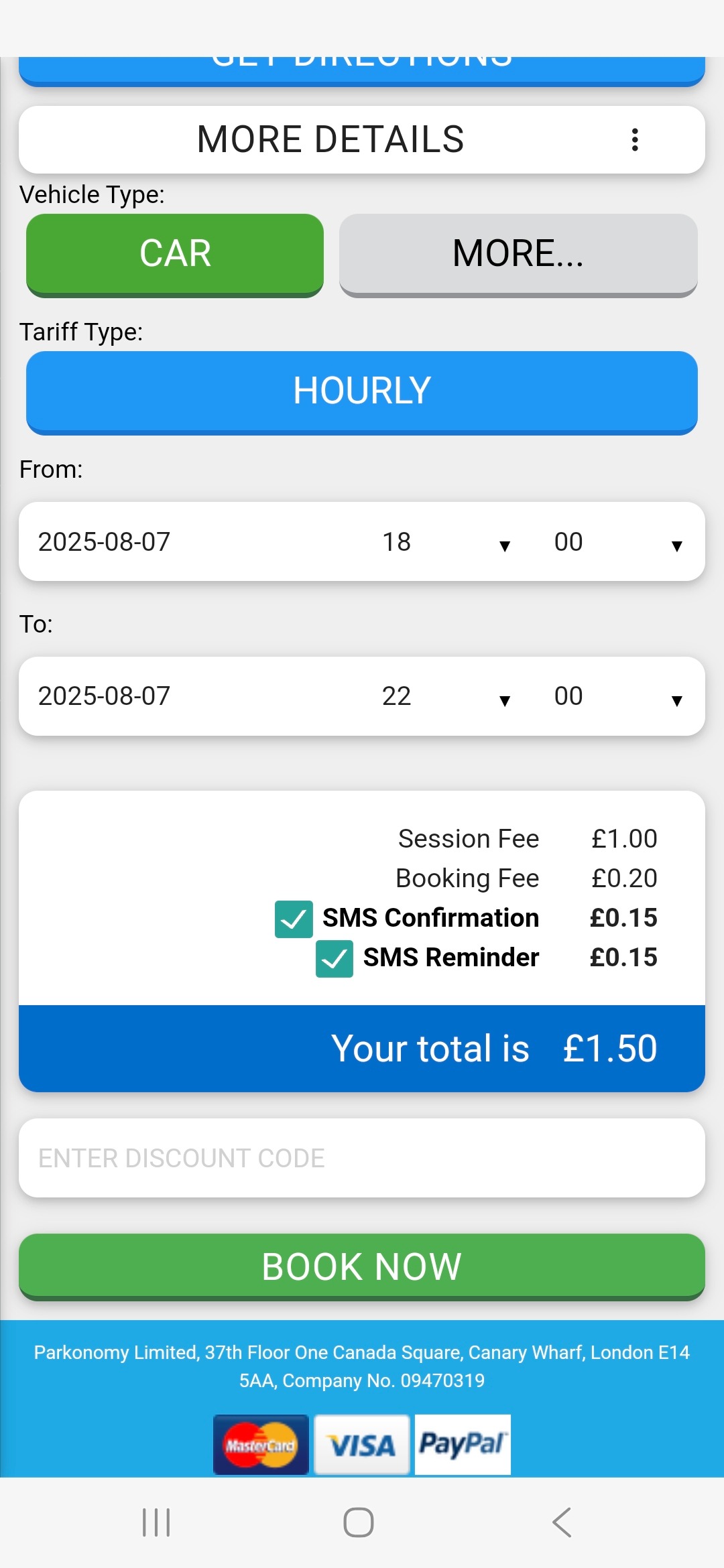 You will now be asked to enter vehicle type, tariff type, arrival time, leaving time, turn on or off SMS confirmation and reminders and add discount code if applicable. Once these details are entered, tap ‘BOOK NOW’ once more. |