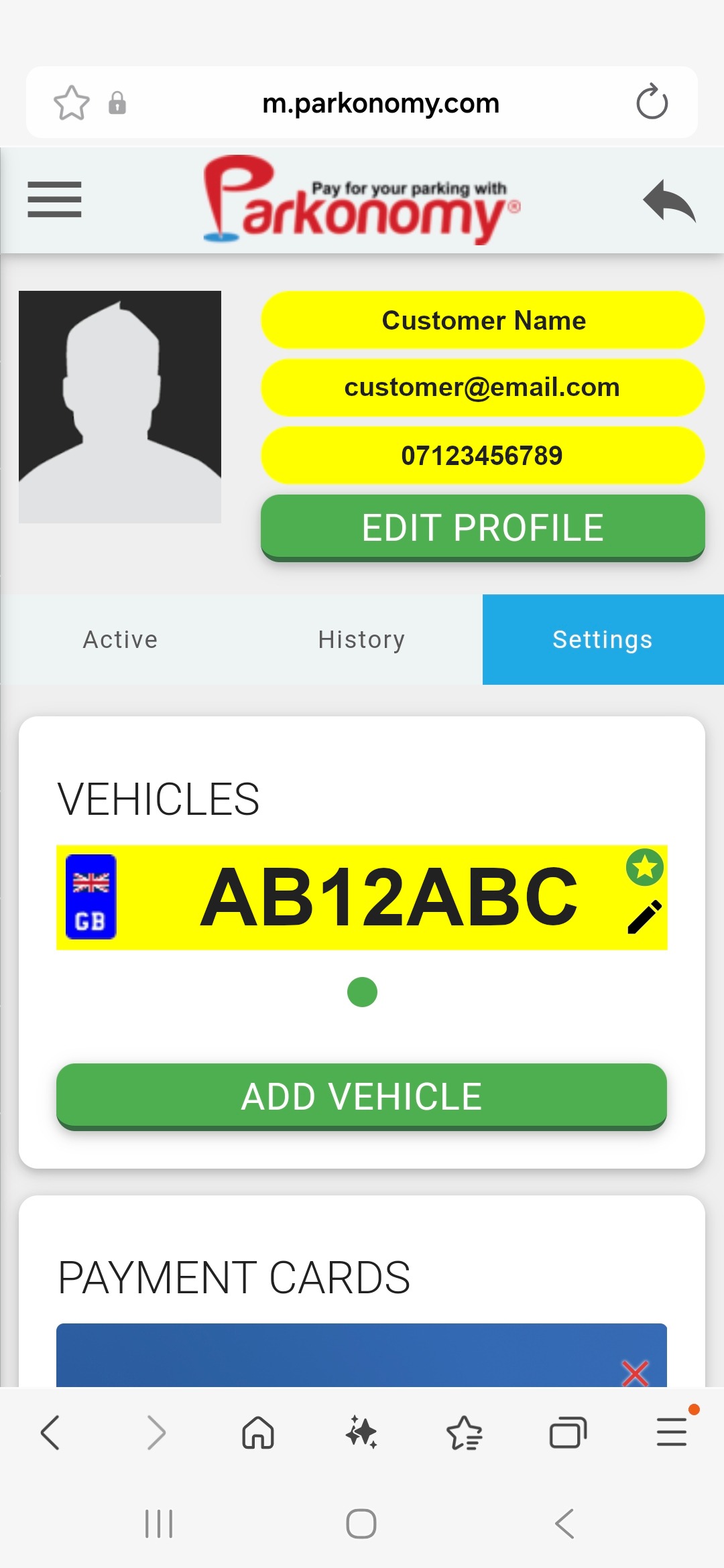 By selecting the settings tab, you will find a page where you can view the default vehicle registration number on your account. To edit the current vehicle, please tap on the pencil icon. To add an additional vehicle registration number, select ‘ADD VEHICLE’. |