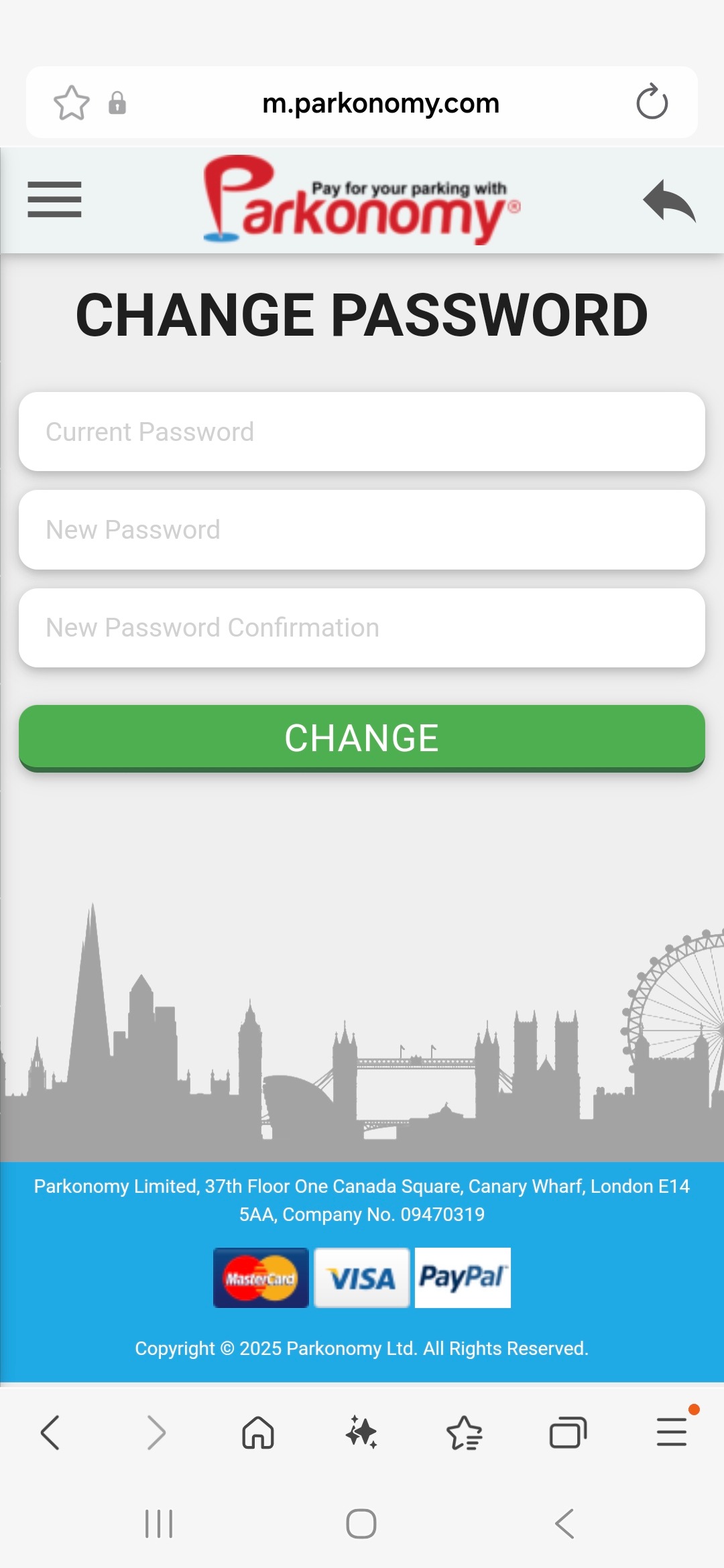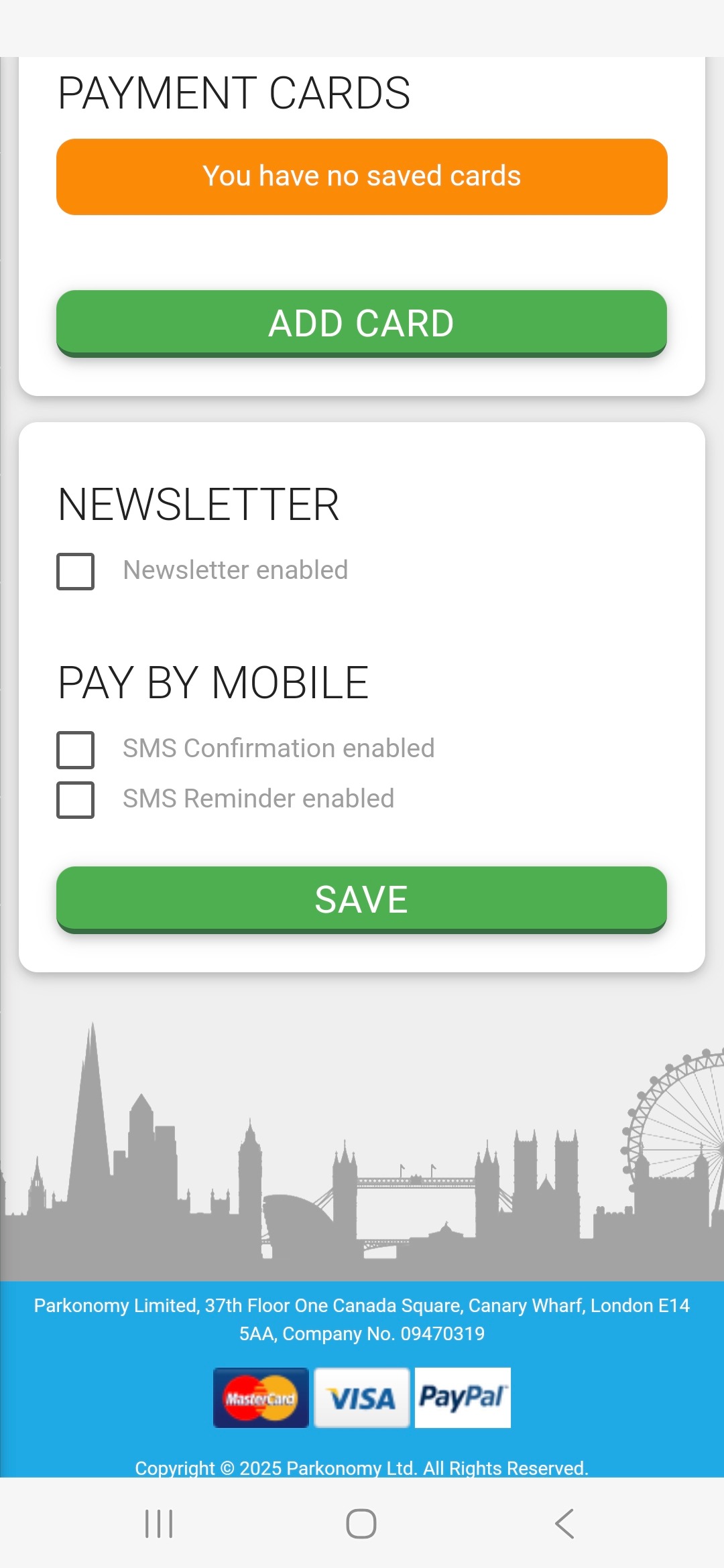 By scrolling down the page reveals payment cards used for previous bookings. Please note you cannot add a new card by selecting ‘ADD CARD’ currently. Parking is paid for during the normal booking process. |