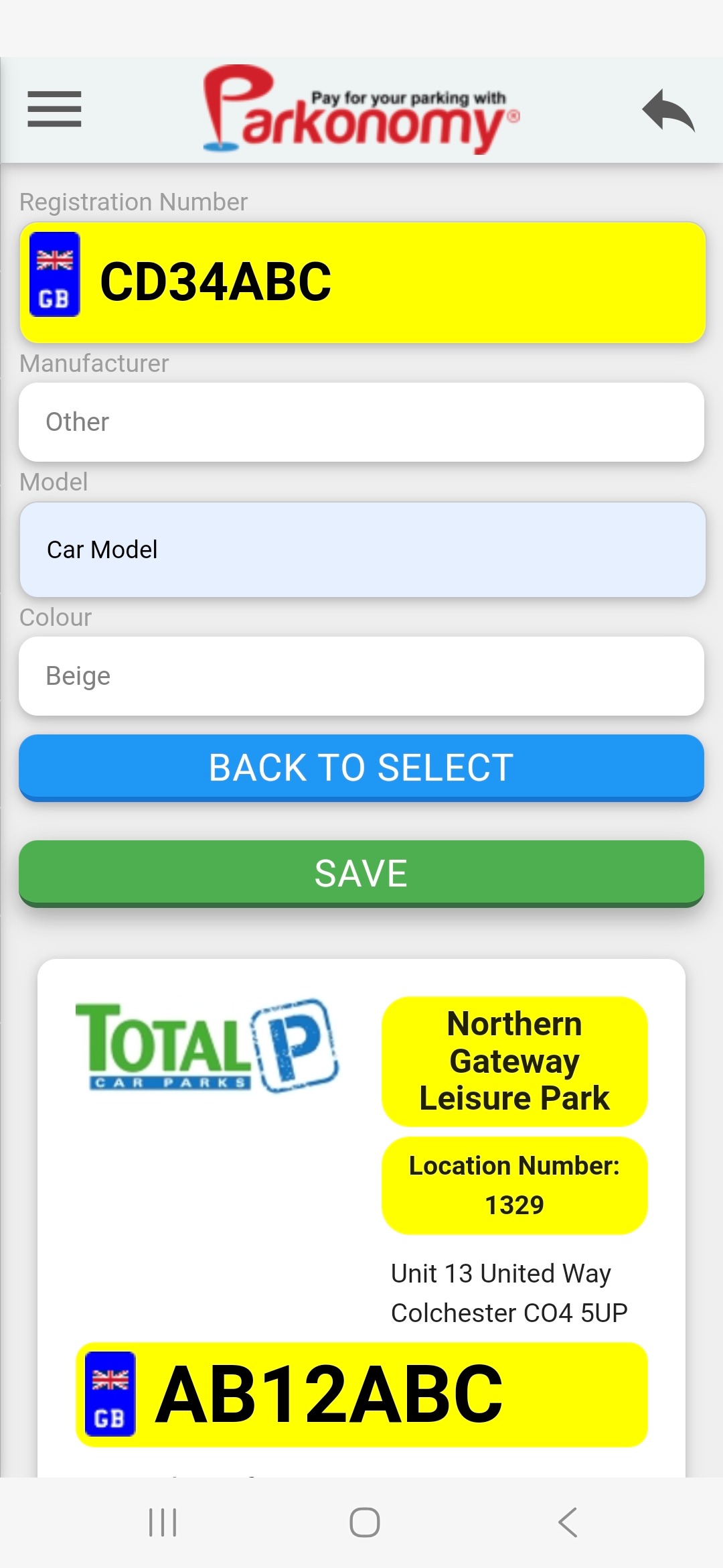 Enter new vehicle registration number and description, then tap 'SAVE'. |